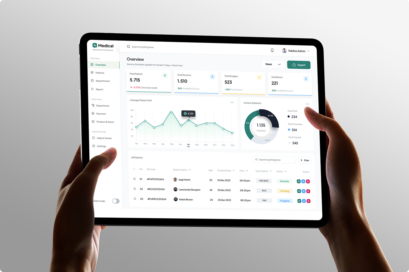 Rabiloo đã phát triển một hệ thống quản lý dữ liệu chung, cho phép lưu trữ, xử lý và chia sẻ dữ liệu bệnh nhân và thông tin bệnh viện một cách an toàn và hiệu quả. Hệ thống này không chỉ giúp quản lý thông tin bệnh nhân/khách hàng mà còn hỗ trợ chia sẻ dữ liệu với các đối tác liên quan thông qua API, đảm bảo tính bảo mật và minh bạch trong việc xử lý dữ liệu y tế.